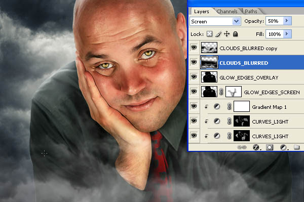 Duplicate the “CLOUD” layer and drag it above the “GLOW_EDGES” layers. Apply a 2-3 pixel Gaussian Blur, then set the Layer Blending Mode to Screen and the Opacity to 50%. Take a soft-edged Eraser and delete all parts of the cloud that spill over the face and details. Duplicate the layer and drag it until you get a fairly even coverage of mist at the bottom of the image. Call these layers “CLOUD_BLURRED.”